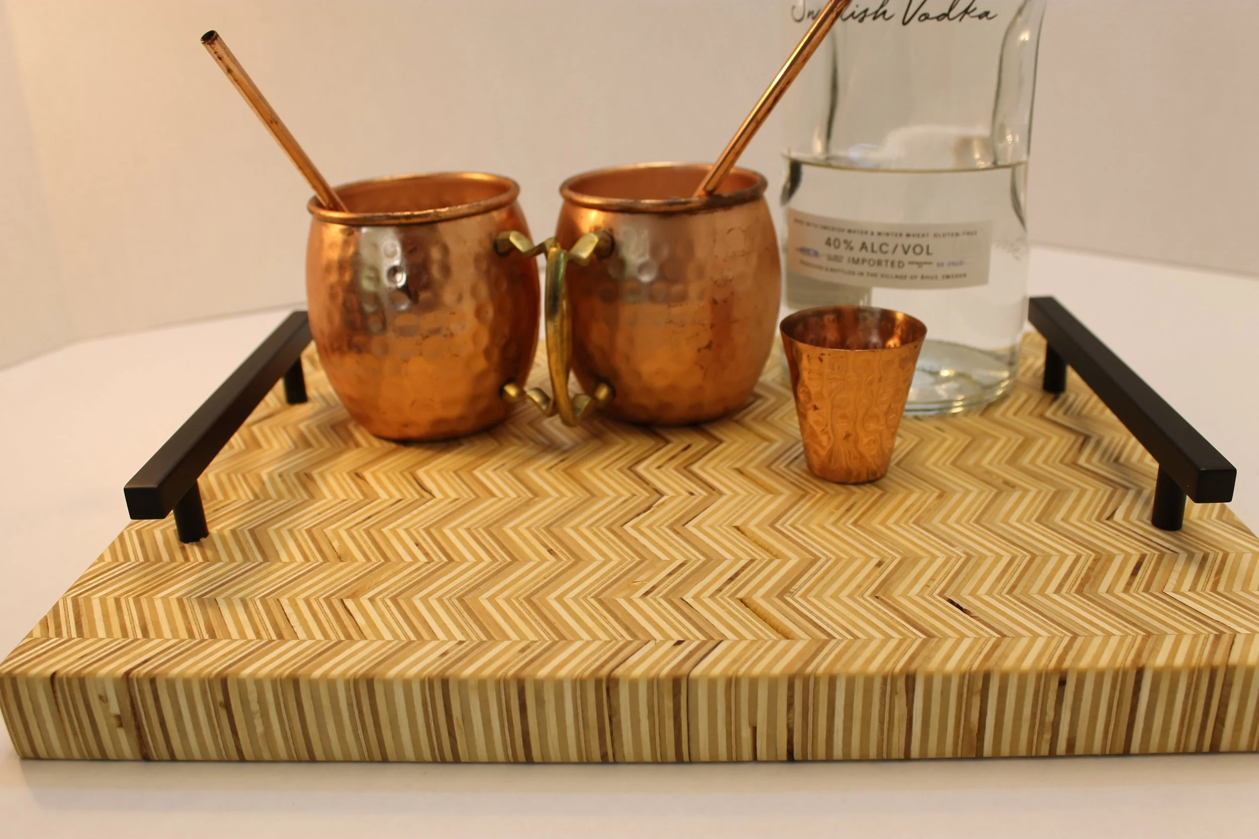 Crafted from end grain mosaic plywood, the tray features a unique arrangement of textures and colors, creating a resilient and beautiful surface.