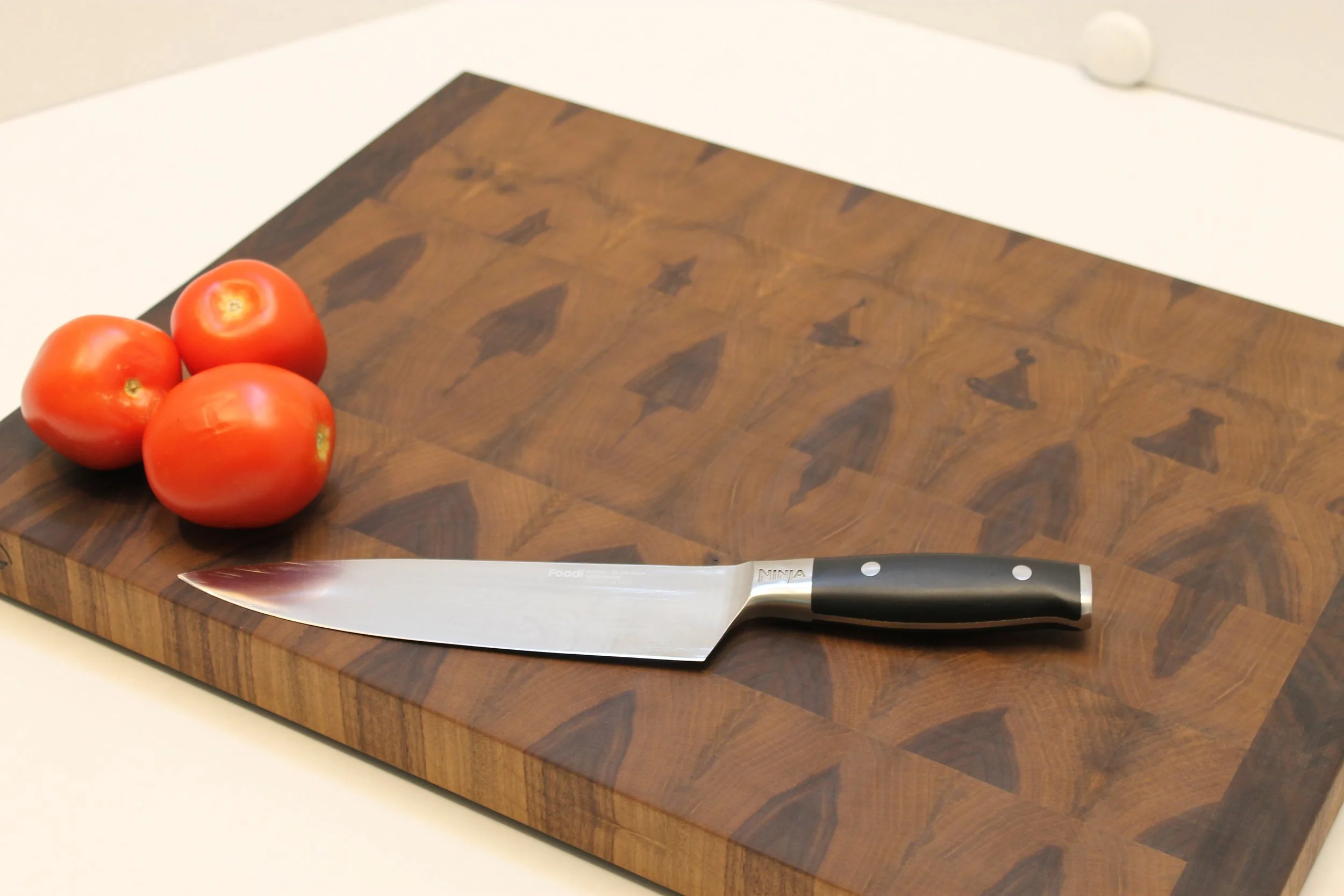 This premium end grain walnut cutting board is a true testament to fine craftsmanship and thoughtful design. Known for its self-healing surface and exceptional durability, the end grain construction is gentle on knives and built to withstand daily use.